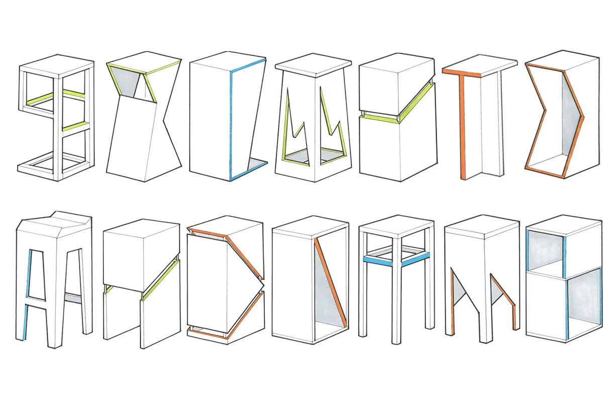 Exploring geometric designs and non-traditional examples of stools. Considering mixed materials using exotic wood and metals.