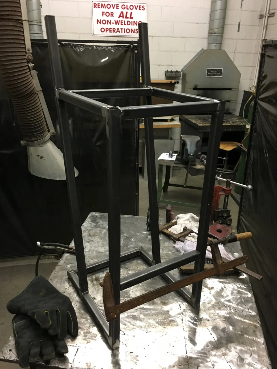Two equal sides welded together by hand. Sanded and finished in matte black with clear coat.